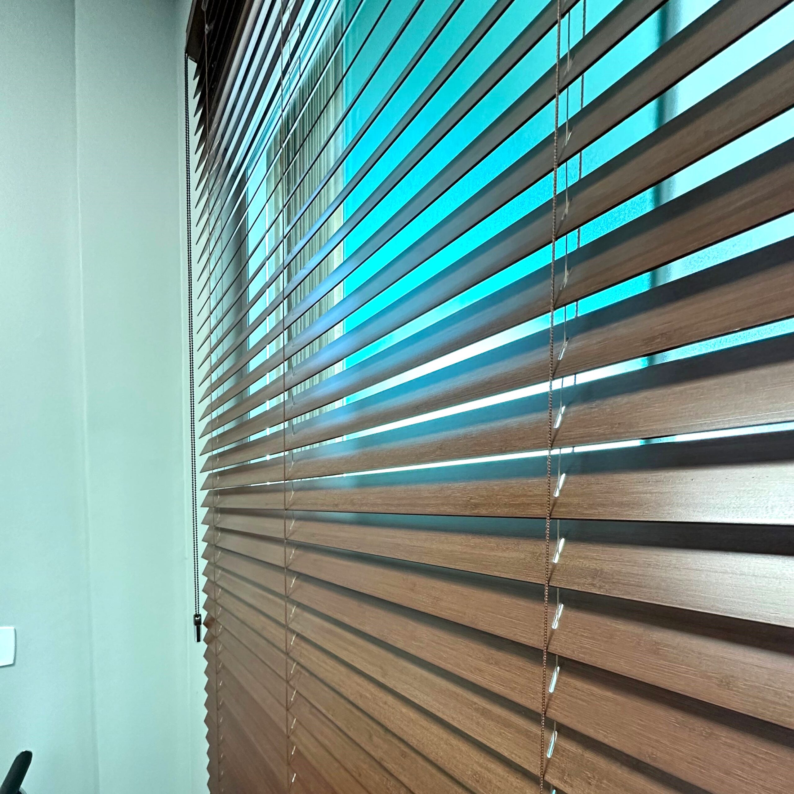 Laqueado ou com acabamento natural. Oferecemos todas as nossas persianas de madeira na lâmina perfeita de 50 mm.